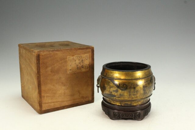 SOLD OUT 中国美術 獣耳 鍍金 銅香炉 紫檀台 うぶ出し品(XA933)