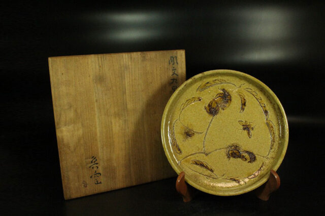 SOLD OUT 北大路魯山人 作 黄瀬戸 彫文九里絵 平鉢 共箱 本物保証(XA941)