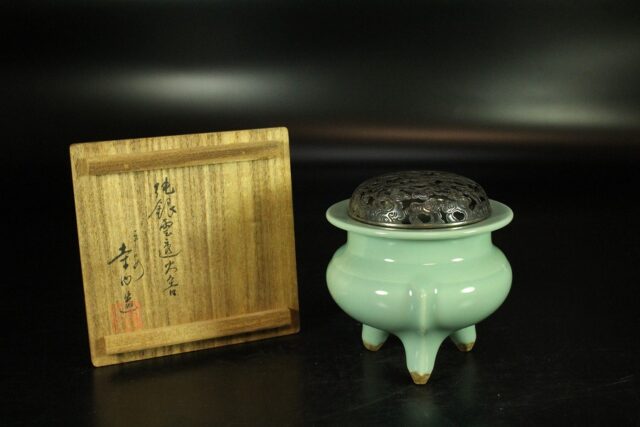 SOLD OUT 青磁袴腰香炉 純銀雲透火屋 寺内造 共箱 美品(XA914)