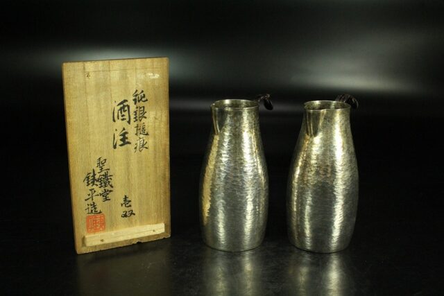 SOLD OUT 純銀槌痕 酒注 鐡霊芝持ち手 聖鐡堂 一対 鉄平造 共箱(XA915)