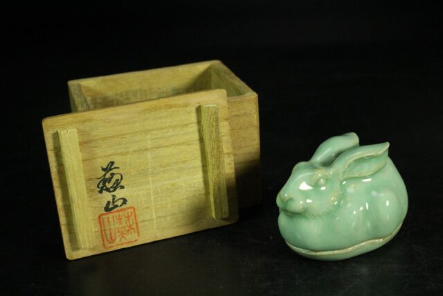 SOLD OUT 帝室技芸員 初代 諏訪蘇山 造 青磁 兎 香合 共箱(XA922)