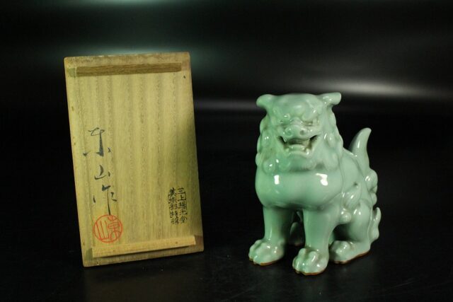 SOLD OUT 初代 宮永東山 造 青磁 唐獅子置物 共箱 美品(XA939)