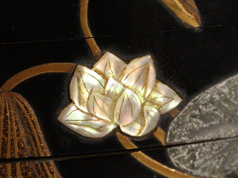 「蓮蜻蛉蒔絵」とは、蓮(はす)と蜻蛉(とんぼ)を組み合わせた図案で施された蒔絵(まきえ)作品を指します。特定の様式や流派を指す固定的な名称というよりは、描かれているモチーフに基づいた一般的な名称です。