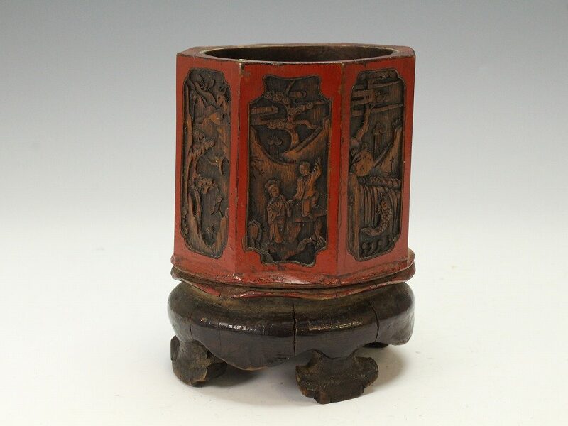 中国美術 竹根 刻 朱漆 八方 開光 風景図 筆筒 清代 文房四宝(BB299)
