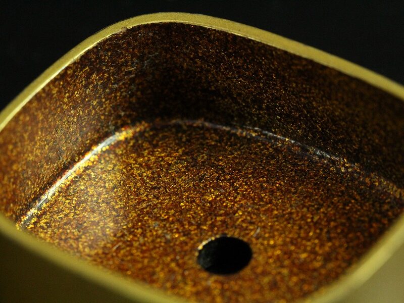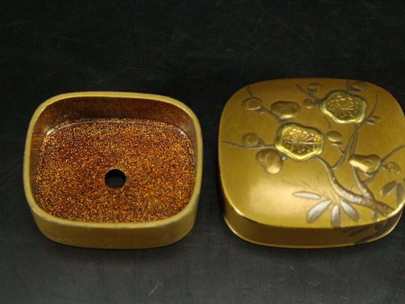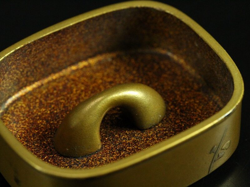 蒔絵とは、漆を塗った器の表面に金属粉や色粉を蒔いて絵や文様を表す、日本独自の漆工芸の技法です。蒔絵は、漆が固まらないうちに金属粉を蒔いて表面に付着させるため、粉を蒔いて絵にするところから「蒔絵」と呼ばれています。