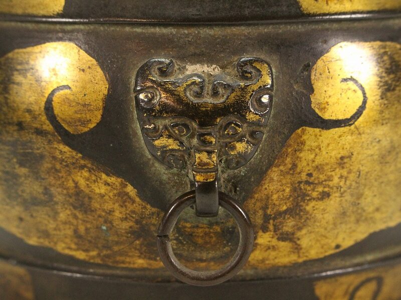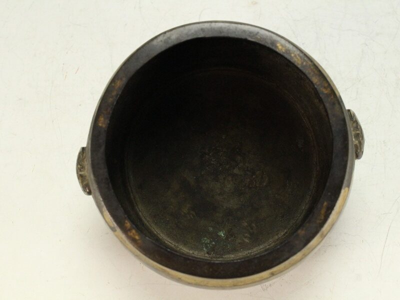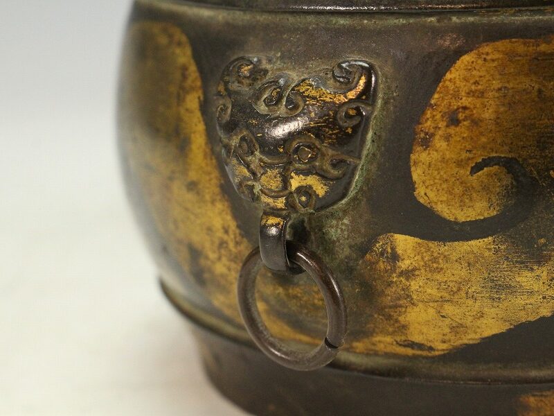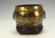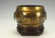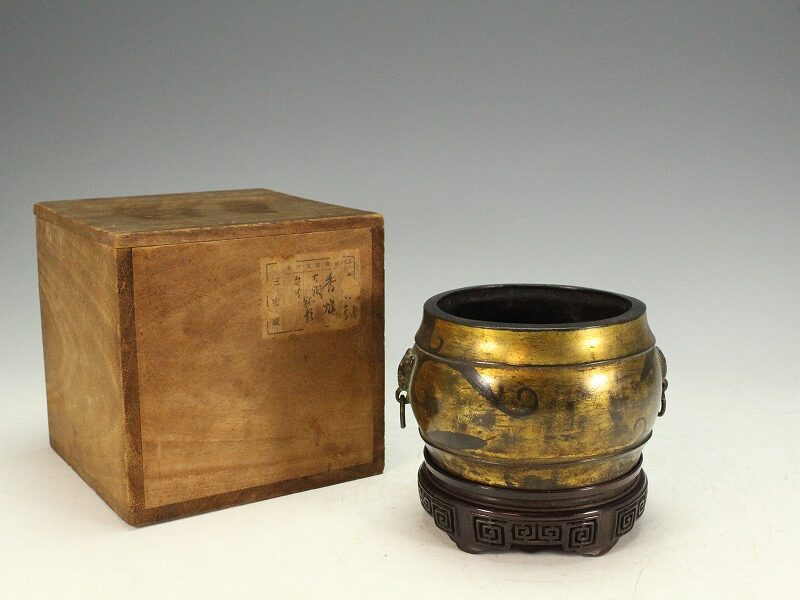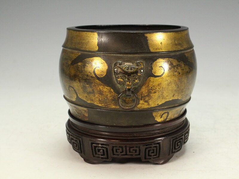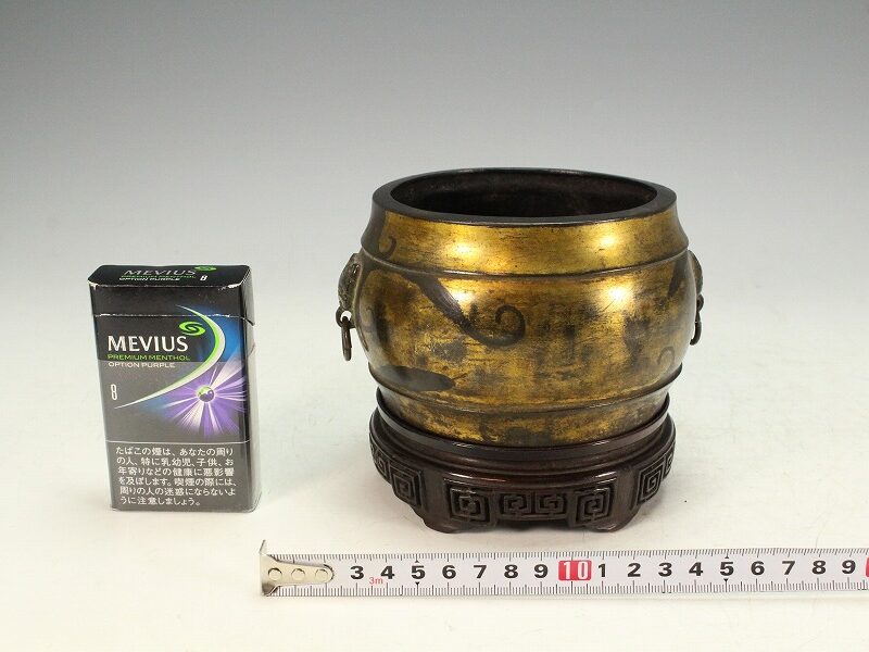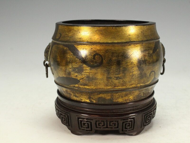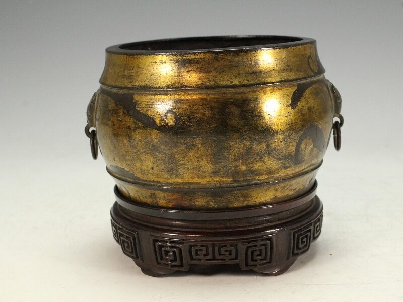 SOLD OUT 中国美術 獣耳 鍍金 銅香炉 紫檀台 うぶ出し品(XA933)