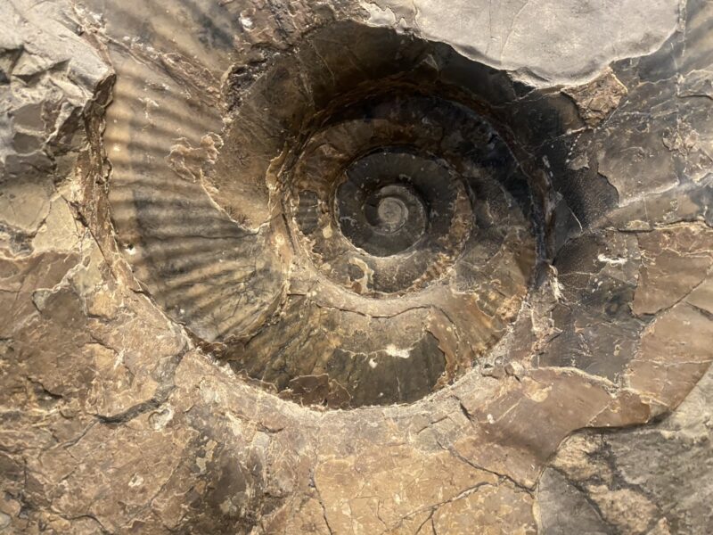 アンモナイトの化石とは、中生代に栄え、白亜紀末に絶滅した「アンモナイト」という古代の軟体動物の殻や体が地層に埋まって化石になったものです。イカやタコと同じ頭足類の仲間で、らせん状に巻いた石灰質の殻を持ち、その内部は多数の部屋に分かれています。世界中で大量に発見されており、当時の地質年代を知る手がかりとなる「示準化石」として重要です。